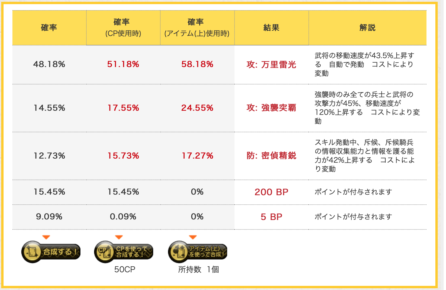 しかしレベルが上がってパンダ×2使用後だったため運任せに持ってる千里雷光をまず使って密偵召集を狙いました、、、大分逝きました、これはヤバイと思って騎兵強行からルートに変更ってなわけです 汗 勢いで合成はダメですね