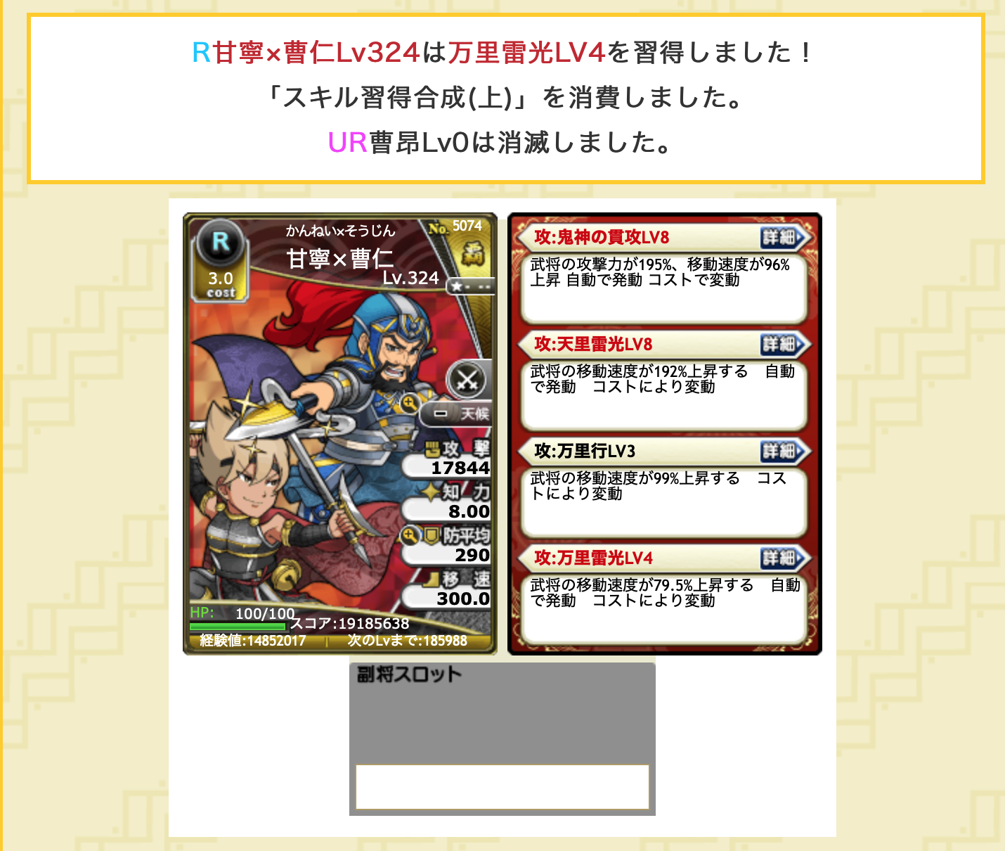 で万里行があると鬼神貫攻から猛将貫攻が狙えたんですよ、、、、(*´ω`*)汗 これについては千里雷光を載せた方が速いけどもR3コスの火力を考えたら猛将貫攻だったのかなってきもしないでもなく という感じで 回想終了